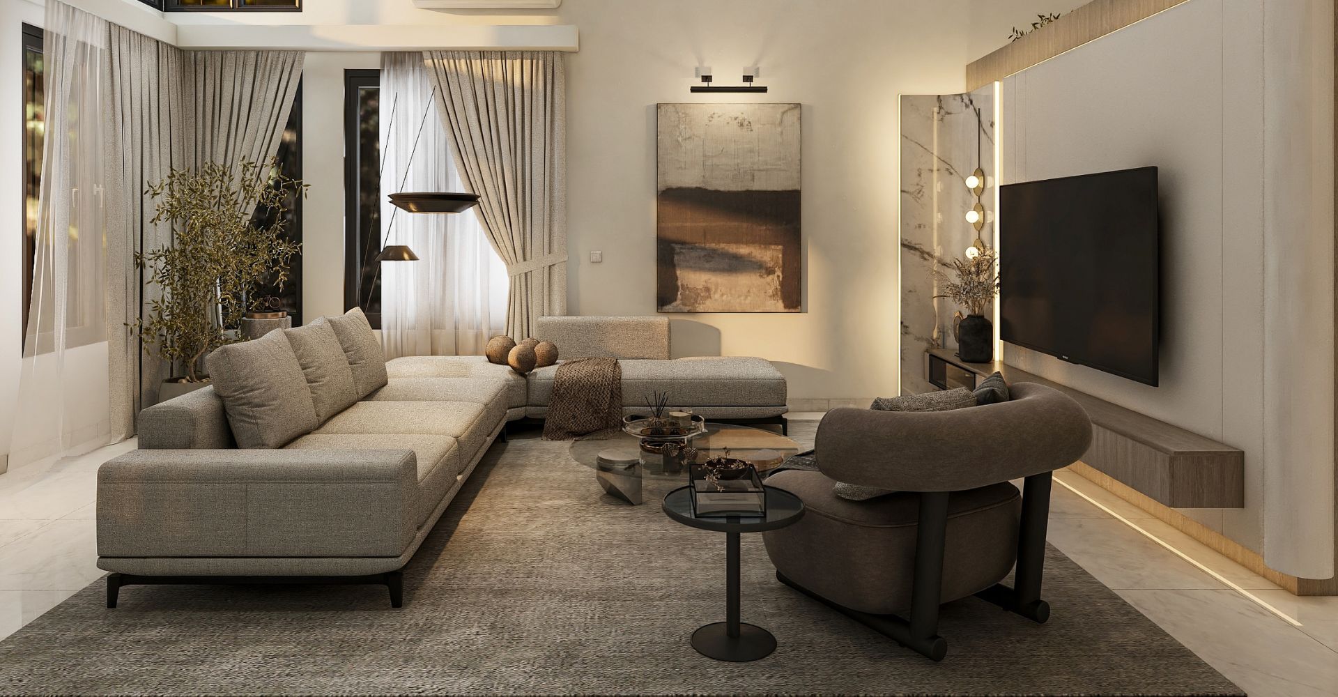 Wood accents were introduced through key furniture, wall finishes, and details to add natural warmth and texture, while modern lighting, neutral tones, and sleek surfaces ensured a contemporary feel throughout the home.