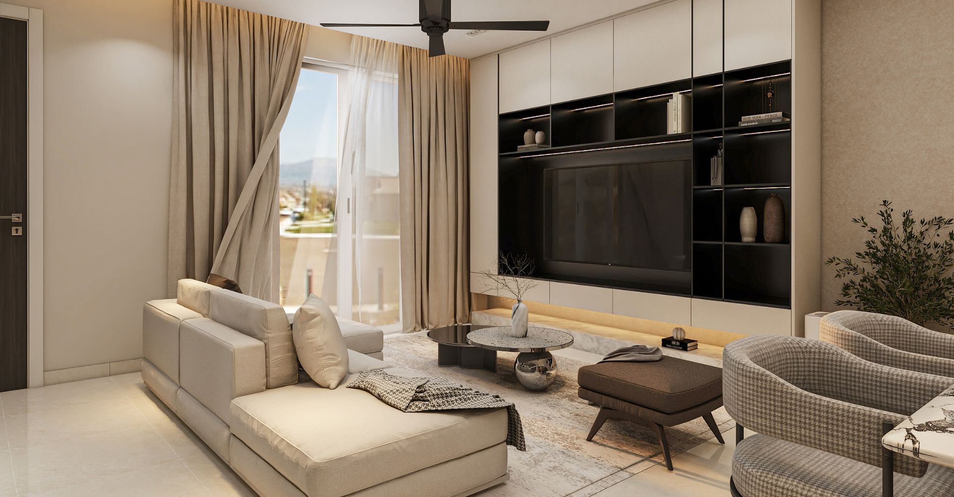 To strike the perfect balance between softness and masculinity, we selected a soft-toned colour scheme, but avoided flat, plain finishes. Instead, we introduced textured cement render on selected walls, adding depth and character while keeping the look modern and grounded.